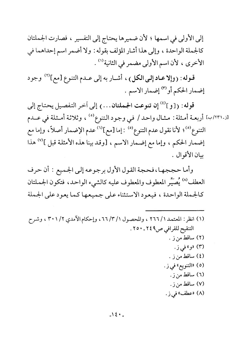 قوله: ([و] (¬4) إِن تنوعت الجملتان ...) إلى آخر التفصيل يحتاج إلى أربعة أمثلة: مثال واحد في وجود التنوع (5)، وثلاثة أمثلة في عدم التنوع (5)؛ لأنا نقول عدم التنوع (¬5): إما [مع] (¬6) عدم الإضمار أصلًا، وإما مع إضمار الحكم، وإما مع إضمار الاسم، [وقد بينا هذه الأمثلة قبل] (¬7) هذا بيان الأقوال.