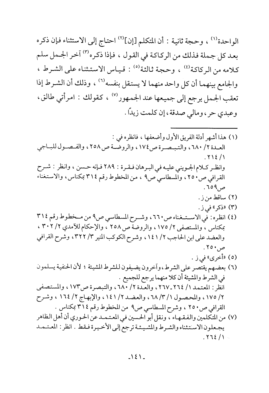 (¬7) من المتكلمين والفقهاء، ونقل أبو الحسن في المعتمد عن الحوري أن أهل الظاهر يجعلون الاستثناء والشرط والمشيئة ترجع إلى الأخيرة فقط. انظر: المعتمد 1/ 264.