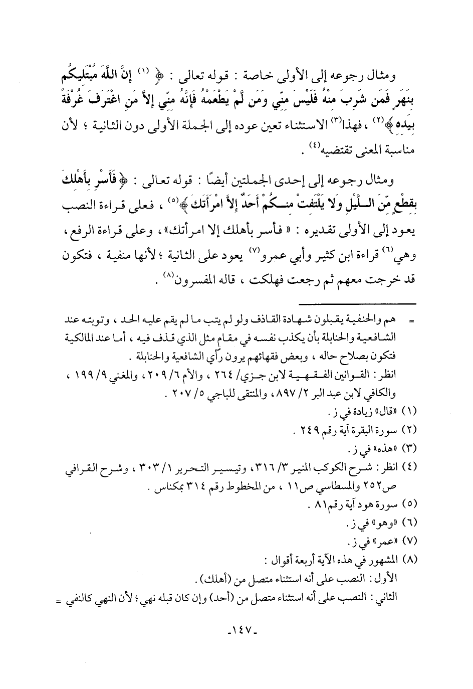 ومثال رجوعه إلى إحدى الجملتين أيضًا: قوله تعالى: {فَأَسْرِ بِأَهْلِكَ بِقِطْعٍ مِّنَ اللَّيْلِ وَلا يَلْتَفِتْ مِنْكُمْ أَحَدٌ إلا امْرَأَتَك} (¬5)، فعلى قراءة النصب يعود إلى الأولى تقديره: "فأسر بأهلك إلا امرأتك"، وعلى قراءة الرفع، وهي (¬6) قراءة ابن كثير وأبي عمرو (¬7) يعود على الثانية؛ لأنها منفية، فتكون قد خرجت معهم ثم رجحت فهلكت، قاله المفسرون (¬8).