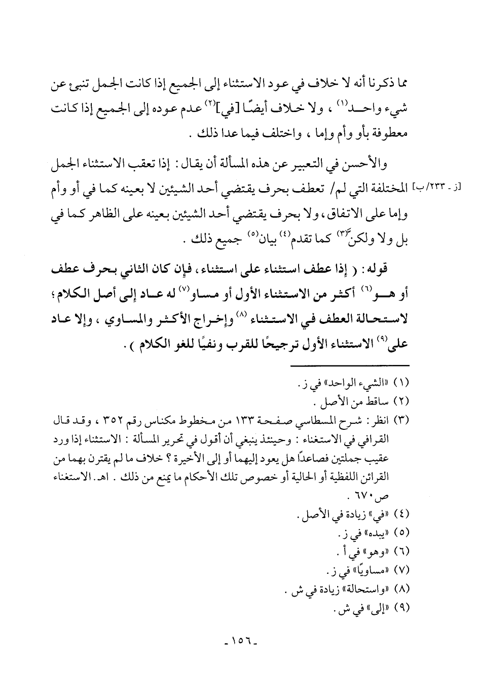 (¬3) انظر: شرح المسطاسي صفحة 133 من مخطوط مكناس رقم 352، وقد قال القرافي في الاستغناء: وحينئذ ينبغي أن أقول في تحرير المسألة: الاستثناء إذا ورد عقيب جملتين فصاعدًا هل يعود إليهما أو إلى الأخيرة؟ خلاف ما لم يقترن بهما من القرائن اللفظية أو الحالية أوخصوص تلك الأحكام ما يمنع من ذلك. اهـ. الاستغناء ص 670.