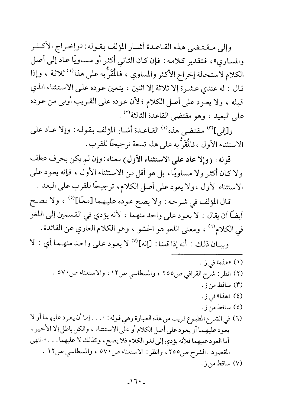 (¬6) في الشرح المطبوع قريب من هذه العبارة وهي قوله: " ... إما أن يعود عليهما أو لا يعود عليهما أو يعود على أصل الكلام أو على الاستثناء، والكل باطل إلا الأخير، أما العود عليهما فلأنه يؤدي إلى لغو الكلام فلا يصح، وكذلك لا عليهما ... " انتهى المقصود. الشرح ص 255، وانظر: الاستغناء ص 570، والمسطاسي ص 12.