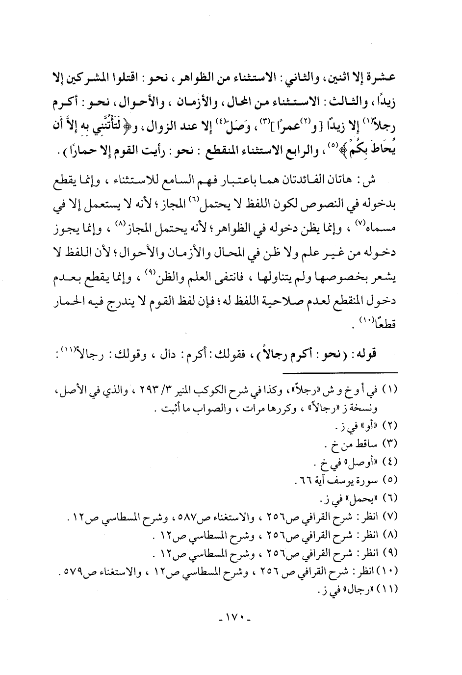 عشرة إِلا اثنين، والثاني: الاستثناء من الظواهر، نحو: اقتلوا المشركين إِلا زيدًا، والثالث: الاستثناء من المحال، والأزمان، والأحوال، نحو: أكرم رجلًا (¬1) إِلا زيدًا [و (¬2) عمرًا] (¬3)، وَصَلّ (¬4) إِلا عند الزوال، و {لَتَأْتُنَّنِي بِهِ إلا أَن يُحَاطَ بِكُمْ} (¬5)، والرابع الاستثناء المنقطع: نحو: رأيت القوم إِلا حمارًا).