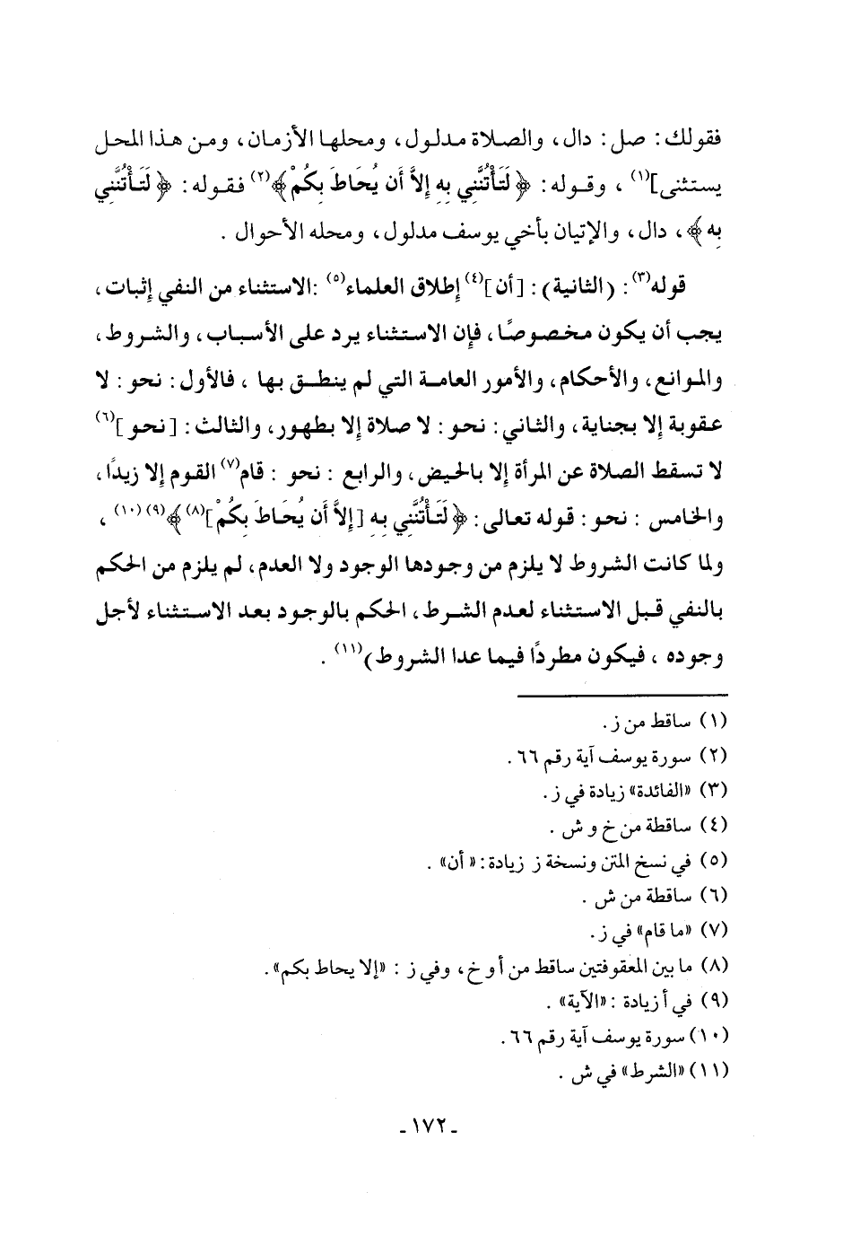 قوله (¬3): (الثانية): [أن] (¬4) إِطلاق العلماء (¬5): الاستثناء من النفي إِثبات، يجب أن يكون مخصوصًا، فإِن الاستثناء يرد على الأسباب، والشروط، والموانع، والأحكام، والأمور العامة التي لم ينطق بها، فالأول: نحو: لا عقوبة إِلا بجناية، والثاني: نحو: لا صلاة إِلا بطهور، والثالث: [نحو] (¬6) لا تسقط الصلاة عن المرأة إِلا بالحيض، والرابع: نحو: قام (¬7) القوم إِلا زيدًا، والخامس: نحو: قوله تعالى: {لَتَأْتُنَّنِي بِهِ [إِلَّا أَنْ يُحَاطَ بِكُمْ] (¬8)} (¬9) (¬10)، ولما كانت الشروط لا يلزم من وجودها الوجود ولا العدم، لم يلزم من الحكم بالنفي قبل الاستثناء لعدم الشرط، الحكم بالوجود بعد الاستثناء لأجل وجوده، فيكون مطردًا فيما عدا الشروط) (¬11).