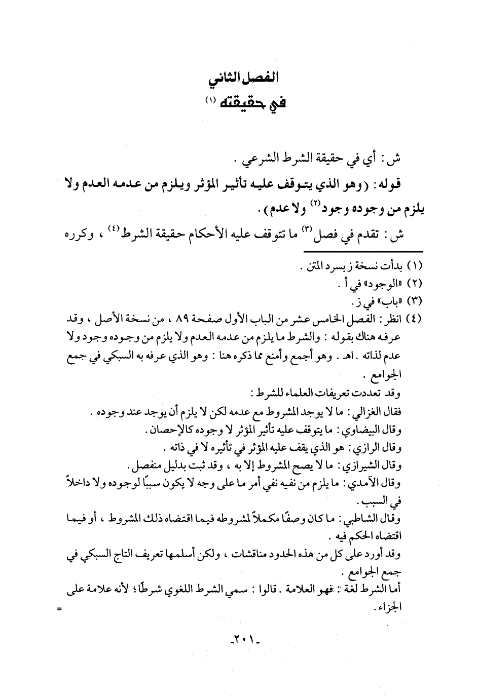 (¬4) انظر: الفصل الخامس عشر من الباب الأول صفحة 89، من نسخة الأصل، وقد عرفه هناك بقوله: والشرط ما يلزم من عدمه العدم ولا يلزم من وجوده وجود ولا عدم لذاته. اهـ. وهو أجمع وأمنع مما ذكره هنا: وهو الذي عرفه به السبكي في جمع الجوامع.