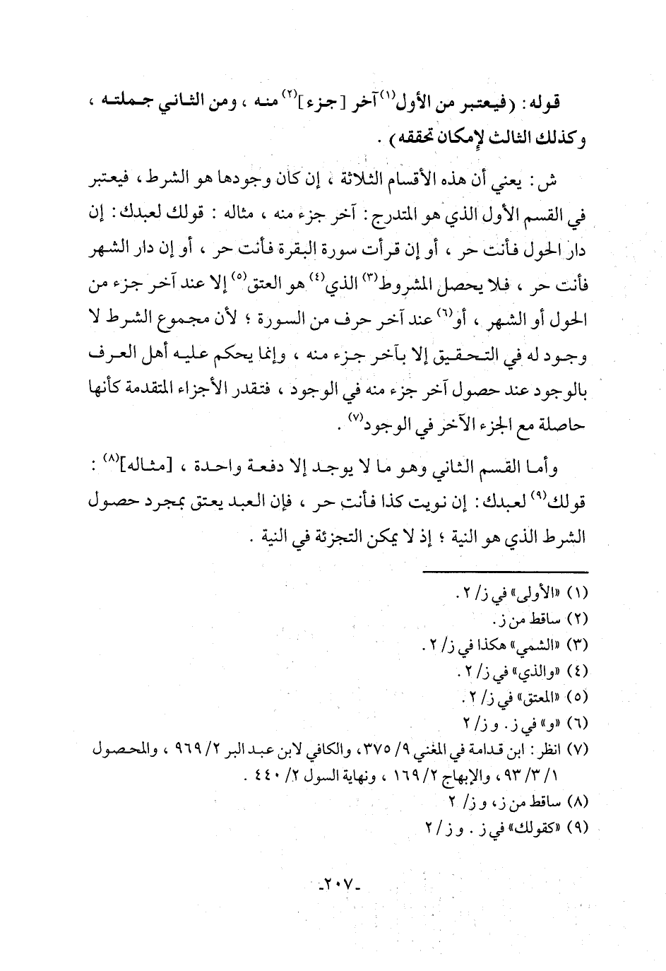 ش: يعني أن هذه الأقسام الثلاثة، إن كان وجودها هو الشرط، فيعتبر في القسم الأول الذي هو المتدرج: آخر جزء منه، مثاله: قولك لعبدك: إن دار الحول فأنت حر، أو إن قرأت سورة البقرة فأنت حر، أو إن دار الشهر فأنت حر، فلا يحصل المشروط (¬3) الذي (¬4) هو العتق (¬5) إلا عند آخر جزء من الحول أو الشهر، أو (¬6) عند آخر حرف من السورة؛ لأن مجموع الشرط لا وجود له في التحقيق إلا بآخر جزء منه، وإنما يحكم عليه أهل العرف بالوجود عند حصول آخر جزء منه في الوجود، فتقدر الأجزاء المتقدمة كأنها حاصلة مع الجزء الآخر في الوجود (¬7).