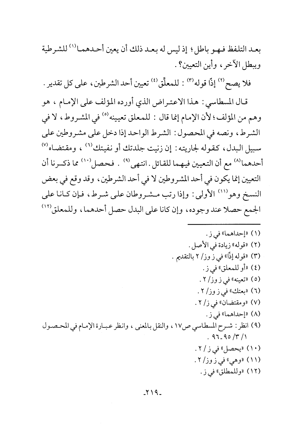 قال المسطاسي: هذا الاعتراض الذي أورده المؤلف على الإمام، هو وهم من المؤلف؛ لأن الإمام إنما قال: للمعلق تعيينه (¬5) في المشروط، لا في الشرط، ونصه في المحصول: الشرط الواحد إذا دخل على مشروطين على سبيل البدل، كقوله لجاريته: إن زنيت جلدتك أو نفيتك (¬6)، ومقتضاه (¬7) أحدهما (¬8) مع أن التعيين فيهما للقائل. انتهى (¬9). فحصل (¬10) مما ذكرنا أن التعيين إنما يكون في أحد المشروطين لا في أحد الشرطين، وقد وقع في بعض النسخ وهو (¬11) الأولى: وإذا رتب مشروطان على شرط، فإن كانا على الجمع حصلا عند وجوده، وإن كانا على البدل حصل أحدهما، وللمعلق (¬12)