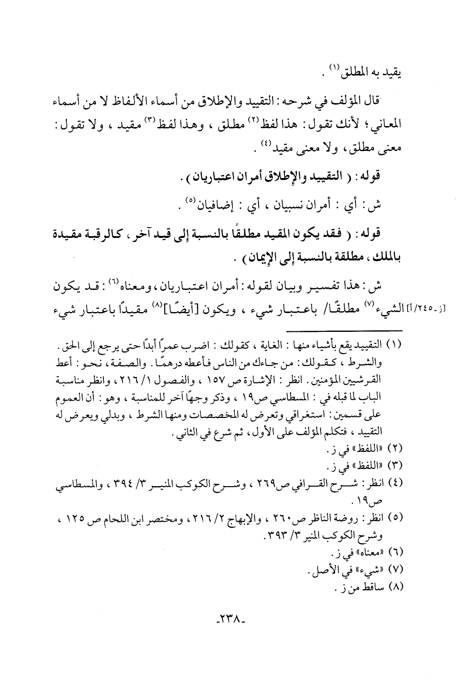 ش: هذا تفسير وبيان لقوله: أمران اعتباريان، ومعناه (¬6): قد يكون الشيء (¬7) مطلقًا باعتبار شيء، ويكون [أيضًا] (¬8) مقيدًا باعتبار شيء