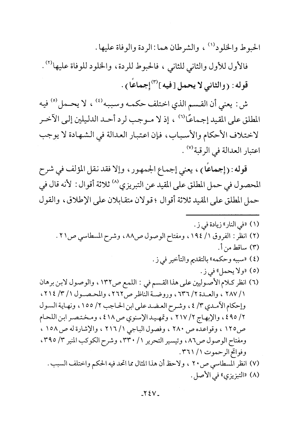(¬6) انظر كلام الأصوليين على هذا القسم في: اللمع ص 132، والوصول لابن برهان 1/ 287، والعدة 2/ 636، وروضة الناظر ص 262، والمحصول 1/ 3/ 214، وإحكام الآمدي 3/ 4، وشرح العضد على ابن الحاجب 2/ 155، ونهاية السول 2/ 495، والإبهاج 2/ 217، وتمهيد الإسنوي ص 418، ومختصر ابن اللحام ص 125، وقواعده ص 280، وفصول الباحي 1/ 216، والإشارة له ص 158، ومفتاح الوصول ص 86، وتيسير التحرير 1/ 330، وشرح الكوكب المنير 3/ 395، وفواتح الرحموت 1/ 361.