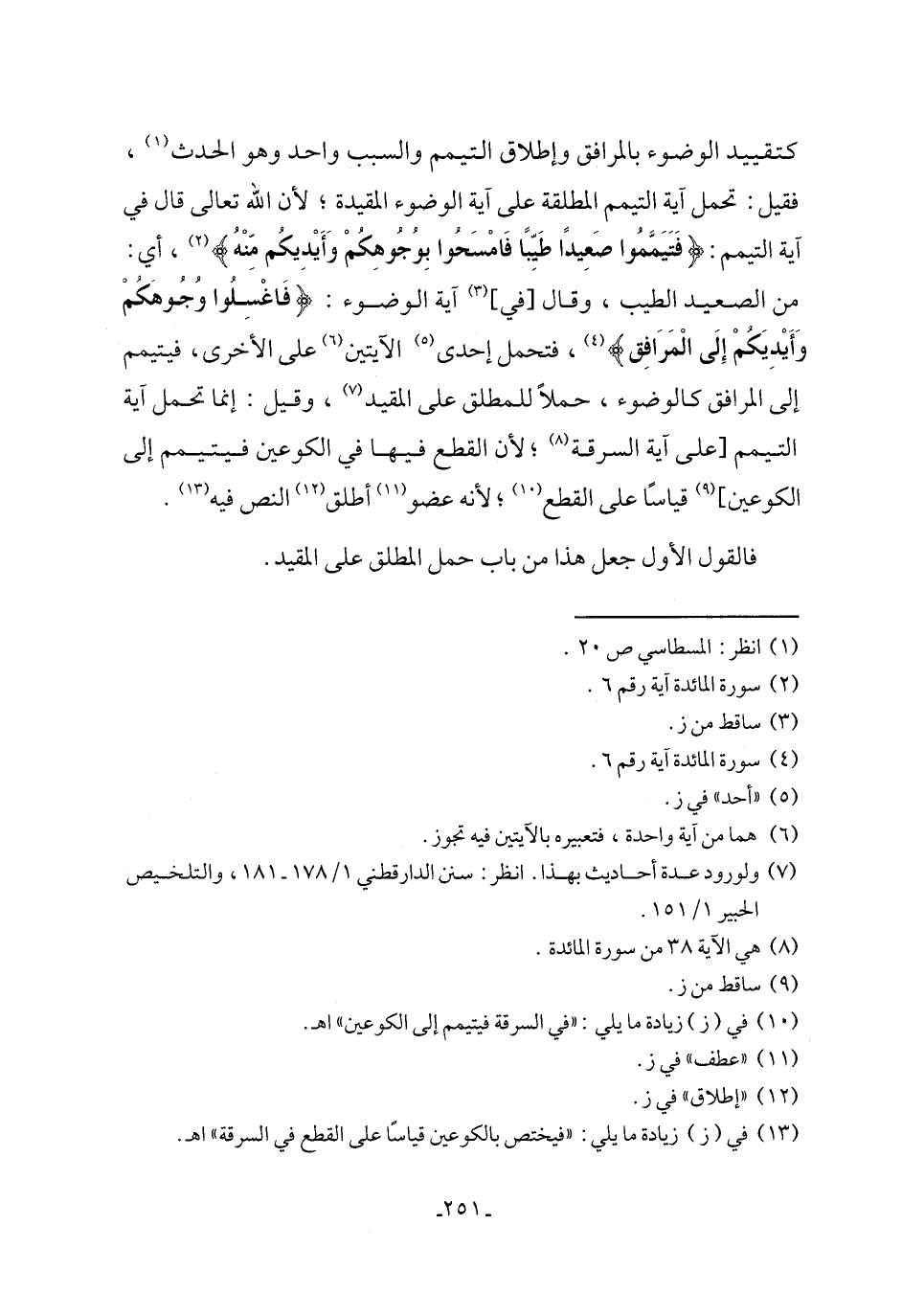 كتقييد الوضوء بالمرافق وإطلاق التيمم والسبب واحد وهو الحدث (¬1)، فقيل: تحمل آية التيمم المطلقة على آية الوضوء المقيدة؛ لأن الله تعالى قال في آية التيمم: {فَتَيَمَّمُوا صَعِيدًا طَيِّبًا فَامْسَحُوا بِوُجُوهِكُمْ وَأَيْدِيكُمْ مِنْهُ} (¬2)، أي: من الصعيد الطيب، وقال [في] (¬3) آية الوضوء: {فَاغْسِلُوا وُجُوهَكُمْ وَأَيْدِيَكُمْ إِلَى الْمَرَافِقِ} (¬4)، فتحمل إحدى (¬5) الآيتين (¬6) على الأخرى، فيتيمم إلى المرافق كالوضوء، حملاً للمطلق على المقيد (¬7)، وقيل: إنما تحمل آية التيمم [على آية السرقة (¬8)؛ لأن القطع فيها في الكوعين فيتيمم إلى الكوعين] (¬9) قياسًا على القطع (¬10)؛ لأنه عضو (¬11) أطلق (¬12) النص فيه (¬13).