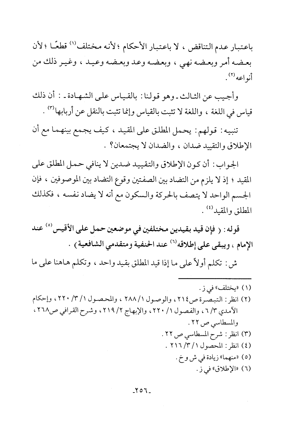 قوله: (فإِن قيد بقيدين مختلفين في موضعين حمل على الأقيس (¬5) عند الإِمام، ويبقى على إِطلاقه (¬6) عند الحنفية ومتقدمي الشافعية).