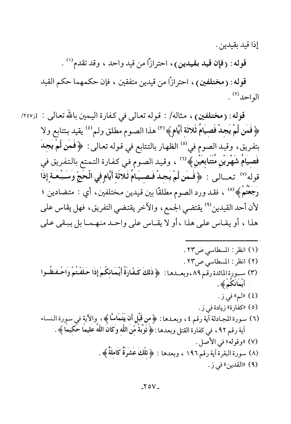 قوله: (مختلفين)، مثاله: قوله تعالى في كفارة اليمين بالله تعالى: {فَمَنْ لَمْ يَجِدْ فَصِيَامُ ثَلَاثَةِ أَيَّامٍ} (¬3) هذا الصوم مطلق ولم (¬4) يقيد بتتابع ولا بتفريق، وقيد الصوم في (¬5) الظهار بالتتابع في قوله تعالى: {فَمَنْ لَمْ يَجِدْ فَصِيَامُ شَهْرَيْنِ مُتَتَابِعَيْنِ} (¬6)، وقيد الصوم في كفارة التمتع بالتفريق في قوله (¬7) تعالى: {فَمَنْ لَمْ يَجِدْ فَصِيَامُ ثَلَاثَةِ أَيَّامٍ فِي الْحَجِّ وَسَبْعَةٍ إِذَا رَجَعْتُمْ} (¬8)، فقد ورد الصوم مطلقًا بين قيدين مختلفين، أي: متضادين؛ لأن أحد القيدين (¬9) يقتضي الجمع، والآخر يقتضي التفريق، فهل يقاس على هذا، أو يقاس على هذا، أو لا يقاس على واحد منهما بل يبقى على