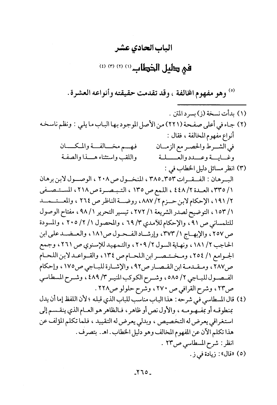(¬2) جاء في أعلى صفحة (221) من الأصل الموجود بها الباب ما يلي: ونظم ناسخه أنواع مفهوم المخالفة، فقال: