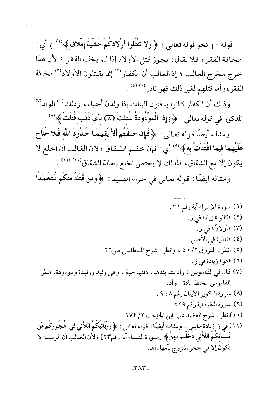 قوله: (نحو قوله تعالى: {وَلَا تَقْتُلُوا أَوْلَادَكُمْ خَشْيَةَ إِمْلَاقٍ} (¬1)) أي: مخافة الفقر، فلا يقال: يجوز قتل الأولاد إذا لم يخف الفقر؛ لأن هذا خرج مخرج الغالب؛ إذ الغالب أن الكفار (¬2) إنما يقتلون الأولاد (¬3) مخافة الفقر، وأما قتلهم لغير ذلك فهو نادر (¬4) (¬5).