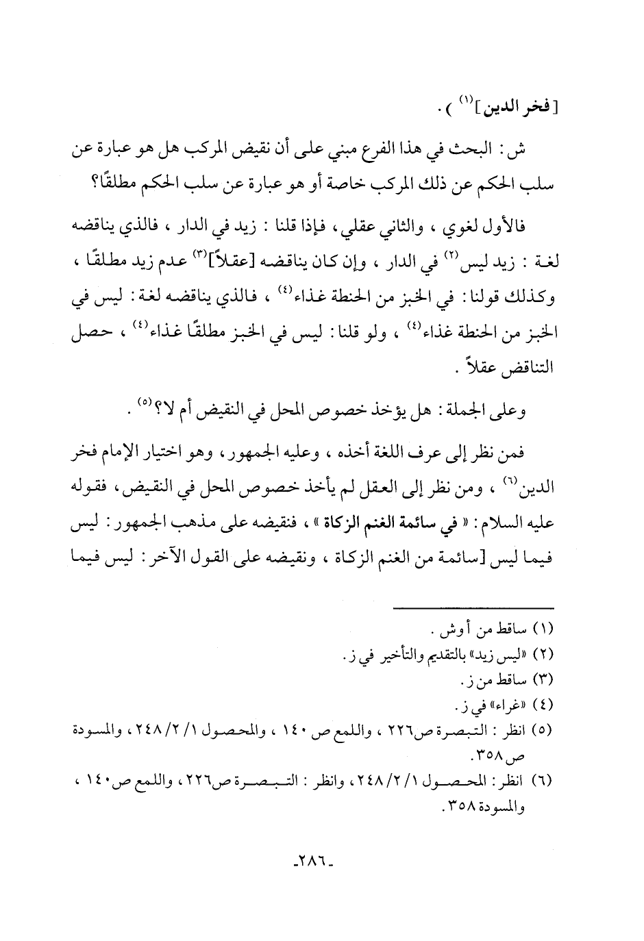 ش: البحث في هذا الفرع مبني على أن نقيض المركب هل هو عبارة عن سلب الحكم عن ذلك المركب خاصة أو هو عبارة عن سلب الحكم مطلقًا؟