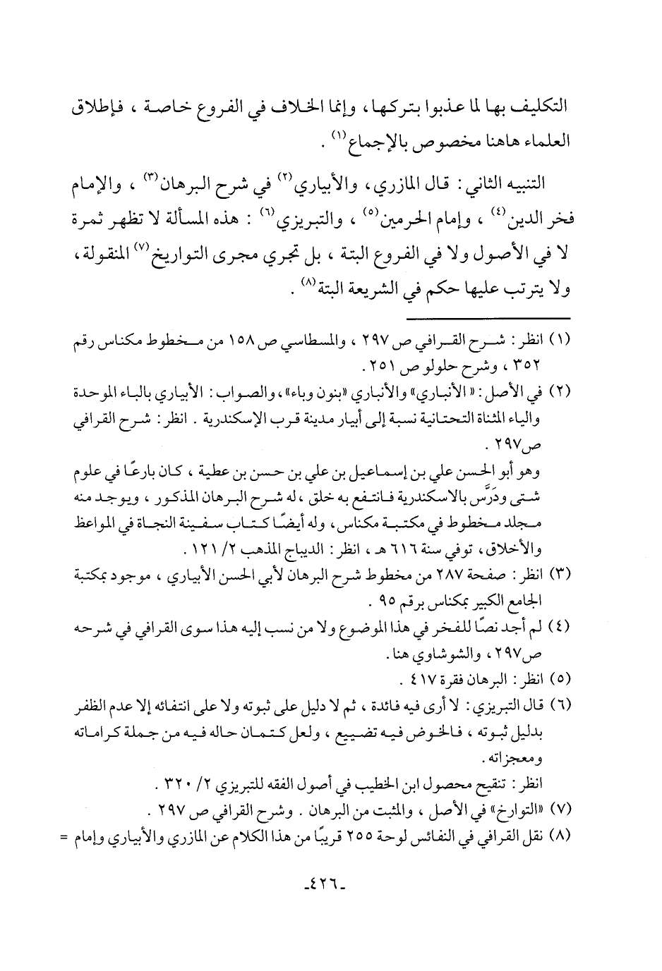 (¬8) نقل القرافي في النفائس لوحة 255 قريبًا من هذا الكلام عن المازري والأبياري وإمام =