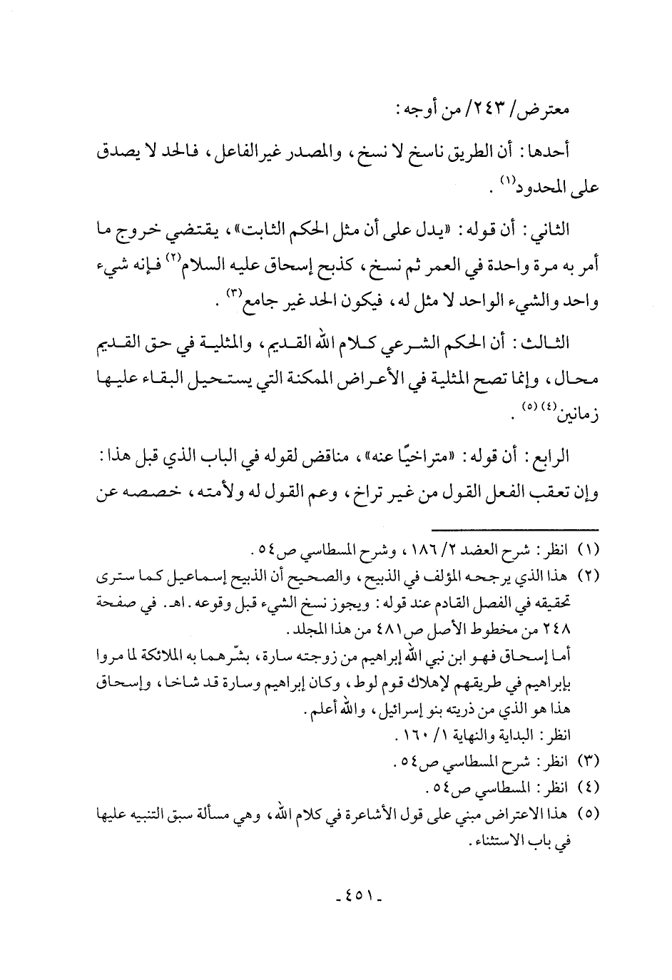 (¬2) هذا الذي يرجحه المؤلف في الذبيح، والصحيح أن الذبيح إسماعيل كما سترى تحقيقه في الفصل القادم عند قوله: ويجوز نسخ الشيء قبل وقوعه. اهـ. في صفحة 248 من مخطوط الأصل ص 481 من هذا المجلد.
