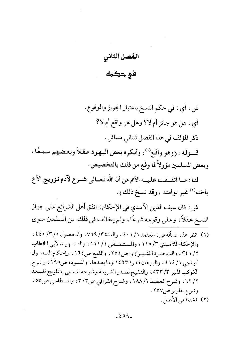ش: قال سيف الدين الآمدي في الإحكام: اتفق أهل الشرائع على جواز النسخ عقلاً، وعلى وقوعه شرعًا، ولم يخالف في ذلك من المسلمين سوى
