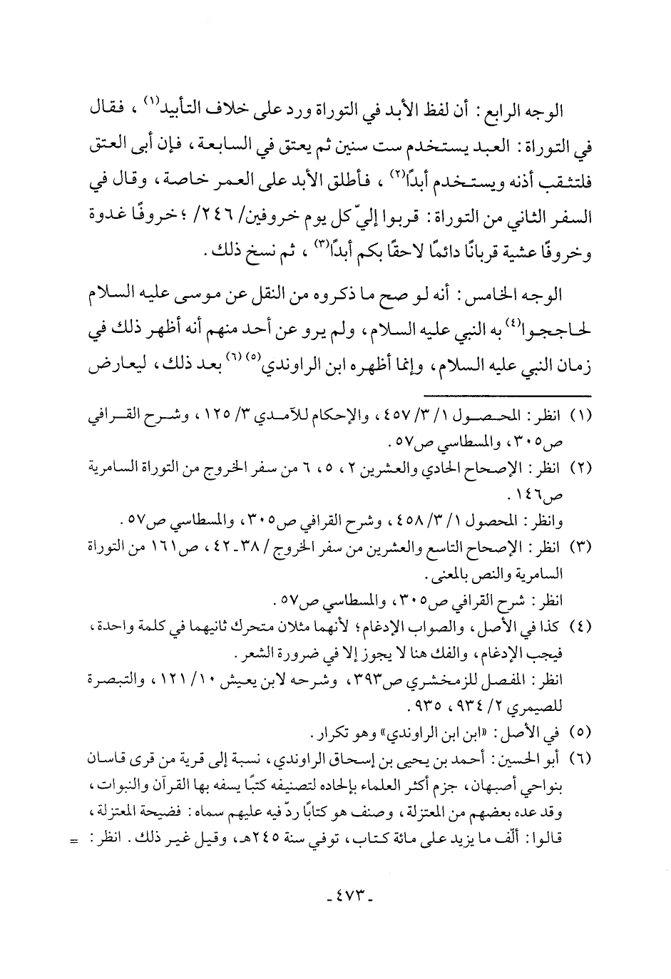 الوجه الخامس: أنه لو صح ما ذكروه من النقل عن موسى عليه السلام لحاججوا (¬4) به النبي عليه السلام، ولم يرو عن أحد منهم أنه أظهر ذلك في زمان النبي عليه السلام، وإنما أظهره ابن الراوندي (¬5) (¬6) بعد ذلك، ليعارض