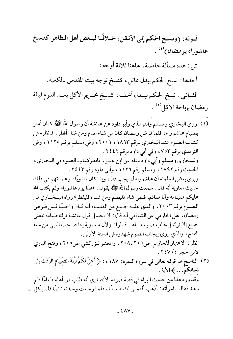 قوله: (ونسخ الحكم إِلى الأثقل، خلافًا لبعض أهل الظاهر كنسخ عاشوراء برمضان) (¬1).