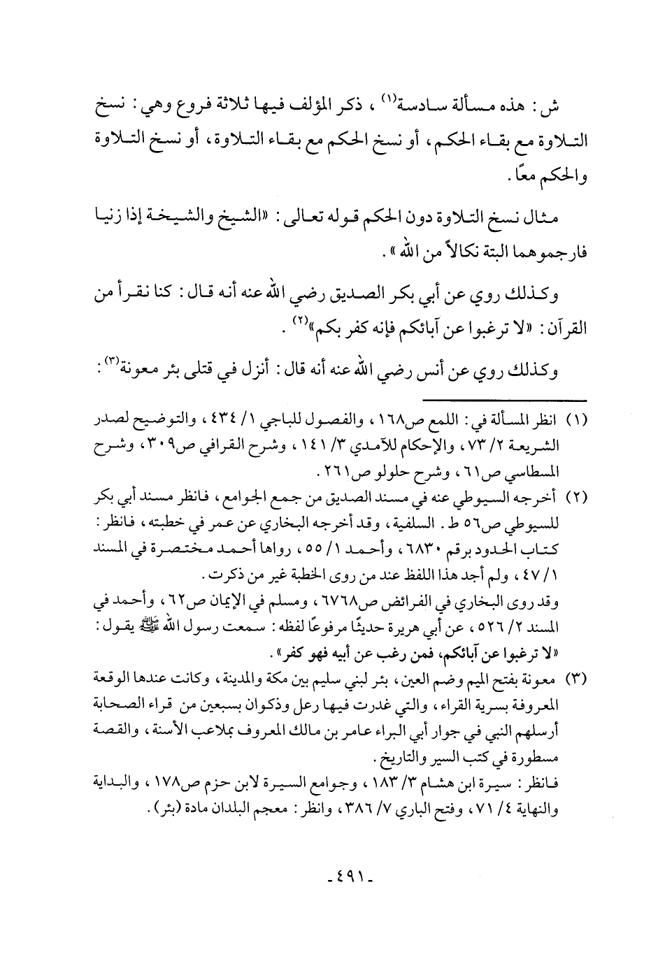 ش: هذه مسألة سادسة (¬1)، ذكر المؤلف فيها ثلاثة فروع وهي: نسخ التلاوة مع بقاء الحكم، أو نسخ الحكم مع بقاء التلاوة، أو نسخ التلاوة والحكم معًا.