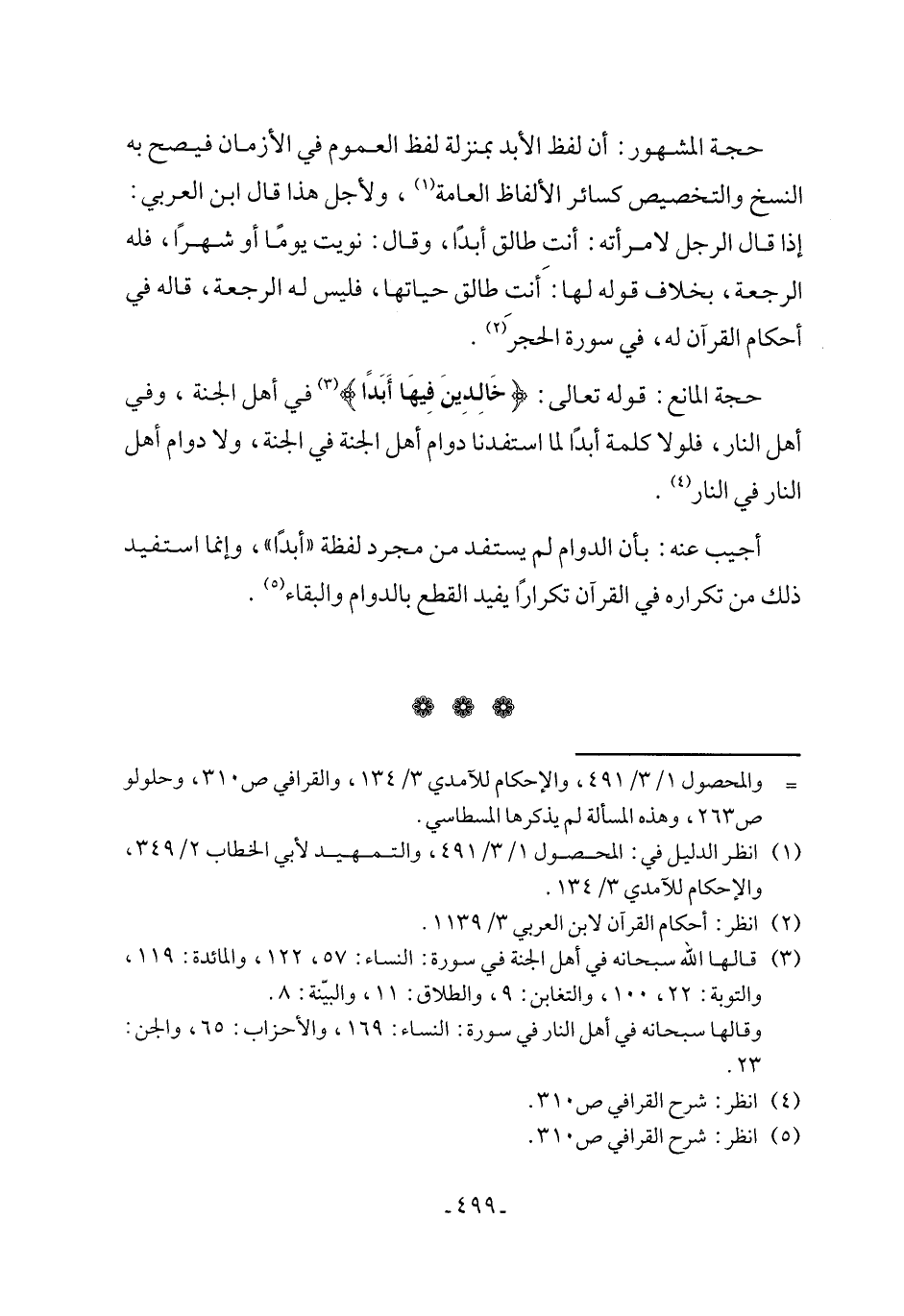 حجة المشهور: أن لفظ الأبد بمنزلة لفظ العموم في الأزمان فيصح به النسخ والتخصيص كسائر الألفاظ العامة (¬1)، ولأجل هذا قال ابن العربي: إذا قال الرجل لامرأته: أنت طالق أبدًا، وقال: نويت يومًا أو شهرًا، فله الرجعة، بخلاف قوله لها: أَنتِ طالق حياتها، فليس له الرجعة، قاله في أحكام القرآن له، في سورة الحجر (¬2).