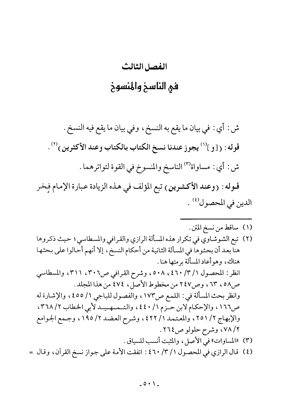 (¬2) تبع الشوشاوي في تكرار هذه المسألة الرازي والقرافي والمسطاسي؛ حيث ذكروها هنا بعد أن بحثوها في المسألة الثانية من أحكام النسخ، إلا أنهم أحالوا على بحثها هناك، وهو أعاد المسألة برمتها هنا.
