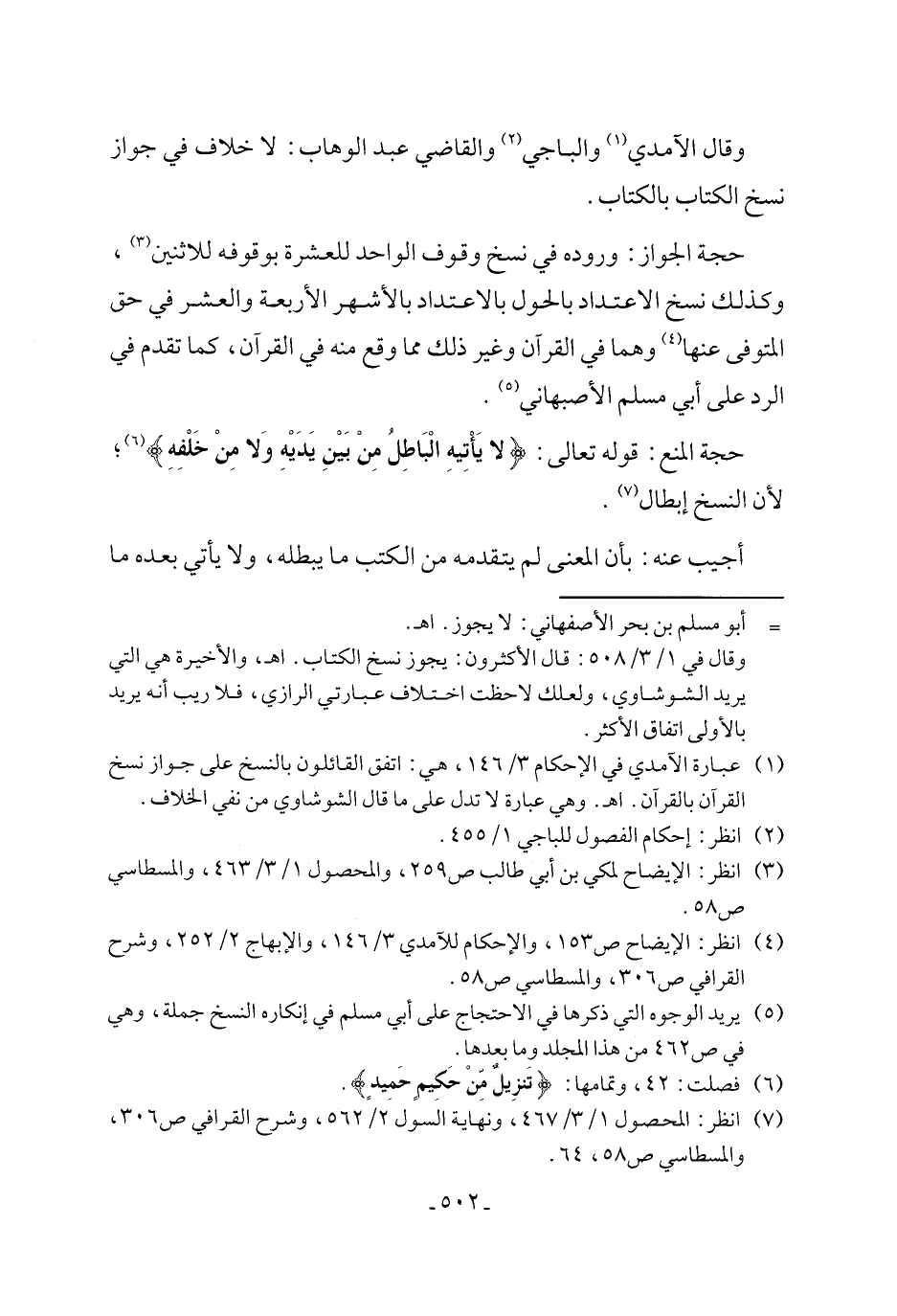 (¬1) عبارة الآمدي في الإحكام 3/ 146، هي: اتفق القائلون بالنسخ على جواز نسخ القرآن بالقرآن. اهـ. وهي عبارة لا تدل على ما قال الشوشاوي من نفي الخلاف.