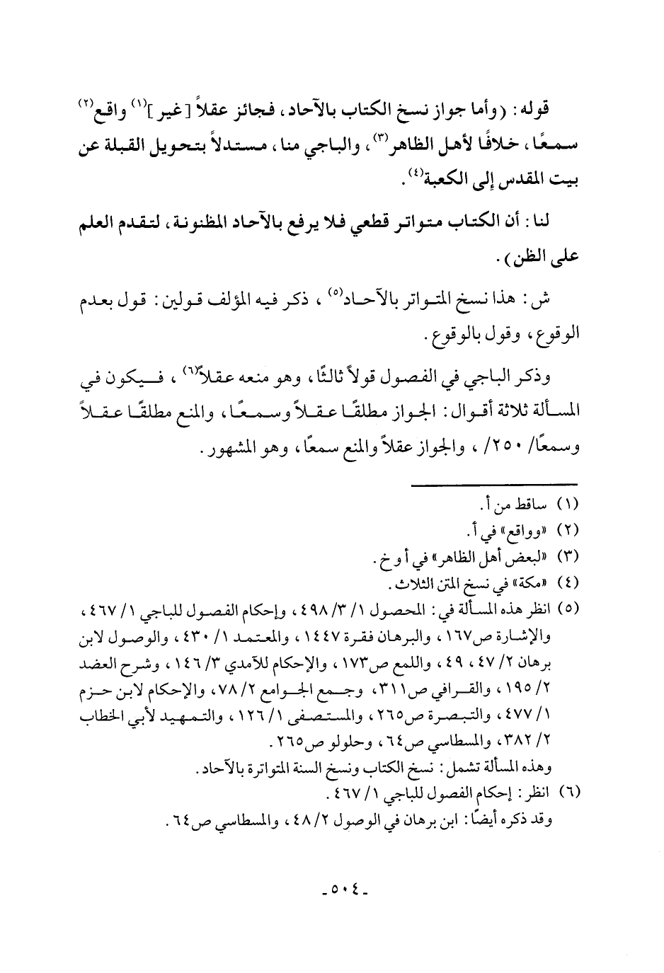 (¬5) انظر هذه المسألة في: المحصول 1/ 3/ 498، وإحكام الفصول للباجي 1/ 467، والإشارة ص 167، والبرهان فقرة 1447، والمعتمد 1/ 430، والوصول لابن برهان 2/ 47، 49، واللمع ص 173، والإحكام للآمدي 3/ 146، وشرح العضد 2/ 195، والقرافي ص 311، وجمع الجوامع 2/ 78، والإحكام لابن حزم 1/ 477، والتبصرة ص 265، والمستصفى 1/ 126، والتمهيد لأبي الخطاب 2/ 382، والمسطاسي ص 64، وحلولو ص 265.