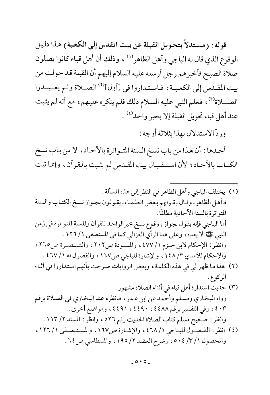 أحدها: أن هذا من باب نسخ السنة المتواترة بالآحاد، لا من باب نسخ الكتاب بالآحاد؛ لأن استقبال بيت المقدس لم يثبت بالقرآن، وإنما ثبت