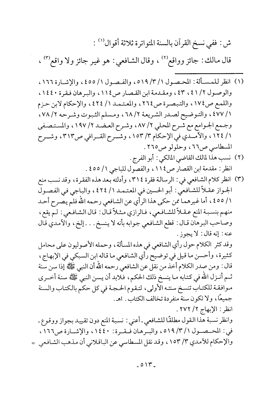 (¬3) انظر كلام الشافعي في: الرسالة فقرة 314، وأدلته بعد هذه الفقرة، وقد نسب منع الجواز عقلاً للشافعي: أبو الحسين في المعتمد 1/ 424، والباجي في الفصول 1/ 455، أما غيرهما ممن حكى هذا الرأي عن الشافعي رحمه الله فلم يصرح أحد منهم بنسبة المنع عقلاً للشافعي، فالرازي مثلاً قال: قال الشافعي: لم يقع، وصاحب البرهان قال: قطع الشافعي جوابه بأنه لا ينسخ ... إلخ، والآمدي قال عنه: إنه قال: لا يجوز.