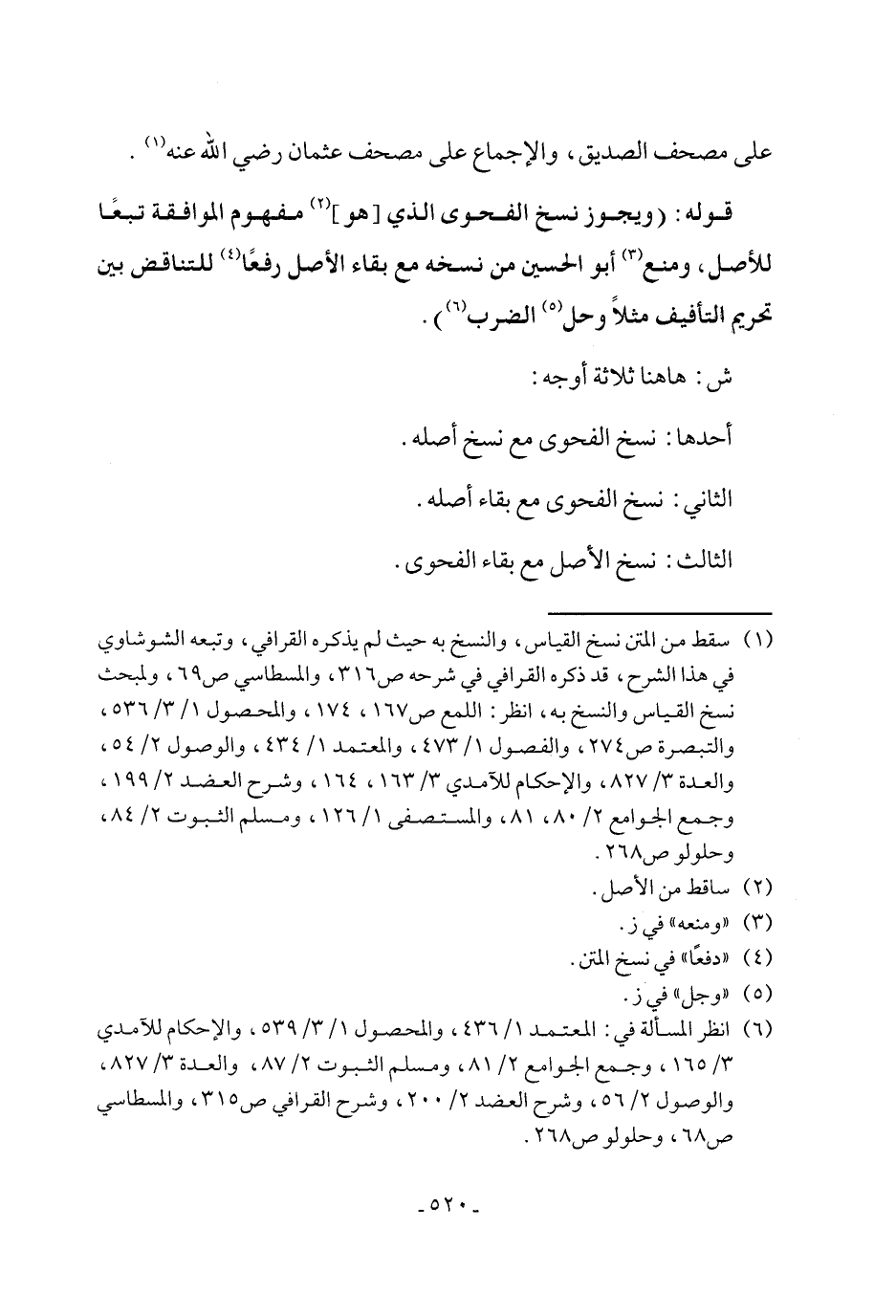 (¬1) سقط من المتن نسخ القياس، والنسخ به حيث لم يذكره القرافي، وتبعه الشوشاوي في هذا الشرح، قد ذكره القرافي في شرحه ص 316، والمسطاسي ص 69، ولمبحث نسخ القياس والنسخ به، انظر: اللمع ص 167، 174، والمحصول 1/ 3/ 536، والتبصرة ص 274، والفصول 1/ 473، والمعتمد 1/ 434، والوصول 2/ 54، والعدة 3/ 827، والإحكام للآمدي 3/ 163، 164، وشرح العضد 2/ 199، وجمع الجوامع 2/ 80، 81، والمستصفى 1/ 126، ومسلم الثبوت 2/ 84، وحلولو ص 268.