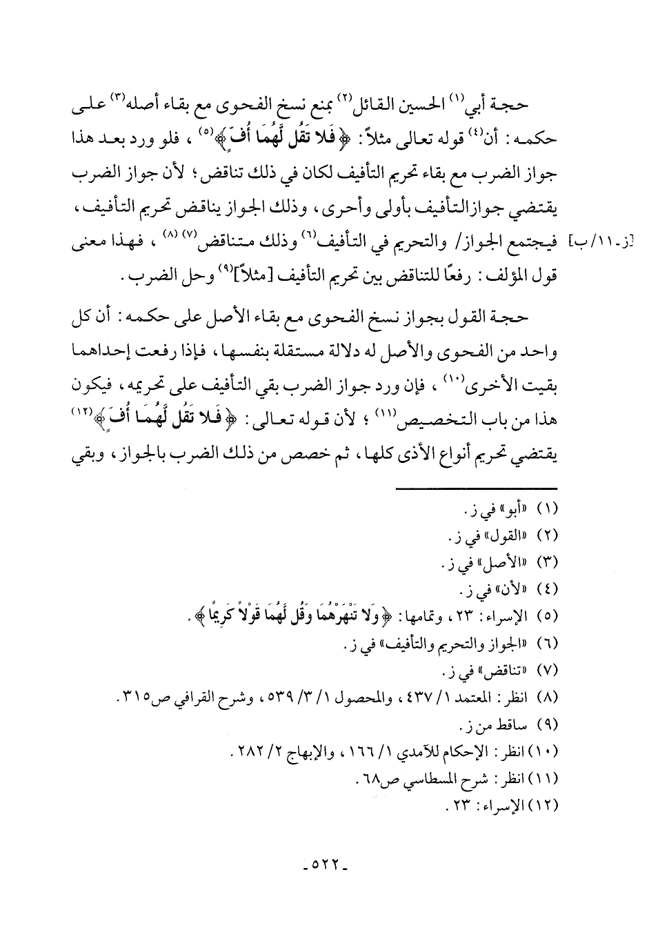 حجة أبي (¬1) الحسين القائل (¬2) بمنع نسخ الفحوى مع بقاء أصله (¬3) على حكمه: أن (¬4) قوله تعالى مثلاً: {فَلَا تَقُلْ لَهُمَا أُفٍّ} (¬5)، فلو ورد بعد هذا جواز الضرب مع بقاء تحريم التأفيف لكان في ذلك تناقض؛ لأن جواز الضرب يقتضي جواز التأفيف بأولى وأحرى، وذلك الجواز يناقض تحريم التأفيف، فيجتمع الجواز والتحريم في التأفيف (¬6) وذلك متناقض (¬7) (¬8)، فهذا معنى قول المؤلف: رفعًا للتناقض بين تحريم التأفيف [مثلاً] (¬9) وحل الضرب.