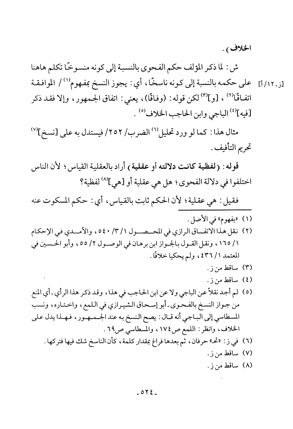 (¬5) لم أجد نقلاً عن الباجي ولا عن ابن الحاجب في هذا، وقد ذكر هذا الرأي - أي المنع من جواز النسخ بالفحوى - أبو إسحاق الشيرازي في اللمع، واختاره، ونسب المسطاسي إلى الباجي أنه قال: يصح النسخ به عند الجمهور، فهذا يدل على الخلاف، وانظر: اللمع ص 174، والمسطاسي ص 69.