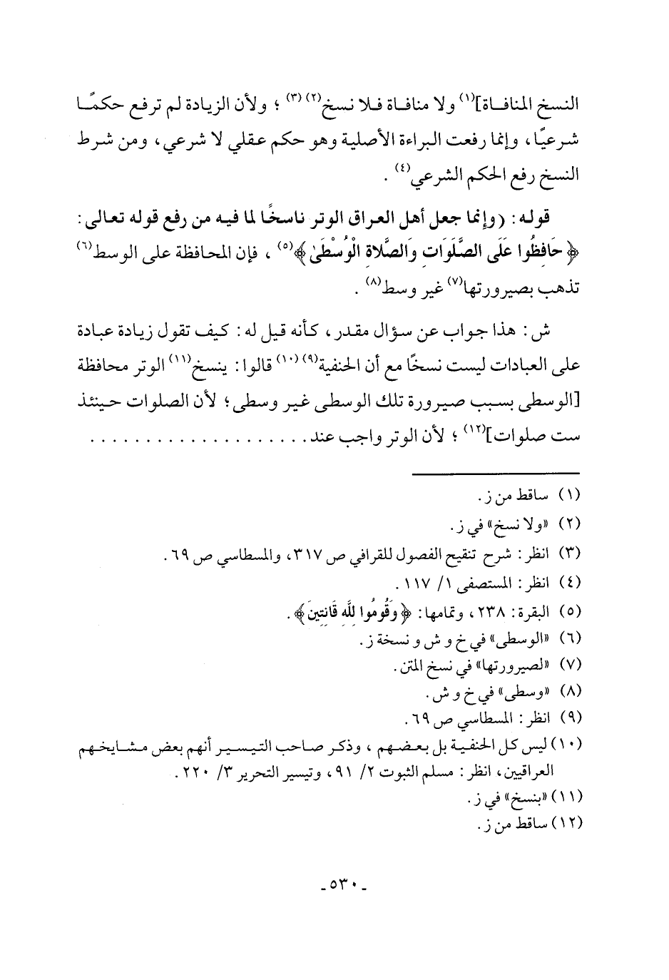 ش: هذا جواب عن سؤال مقدر، كأنه قيل له: كيف تقول زيادة عبادة على العبادات ليست نسخًا مع أن الحنفية (¬9) (¬10) قالوا: ينسخ (¬11) الوتر محافظة [الوسطى بسبب صيرورة تلك الوسطى غير وسطى؛ لأن الصلوات حينئذ ست صلوات] (¬12)؛ لأن الوتر واجب عند .............................