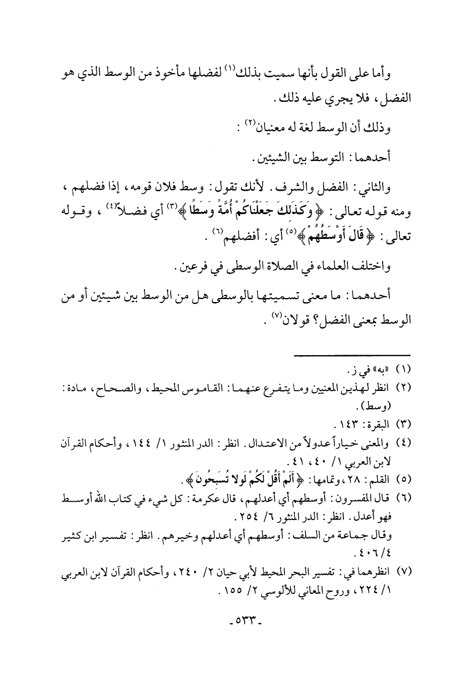 والثاني: الفضل والشرف. لأنك تقول: وسط فلان قومه، إذا فضلهم، ومنه قوله تعالى: {وَكَذَلِكَ جَعَلْنَاكُمْ أُمَّةً وَسَطًا} (¬3) أي فضلاً (¬4)، وقوله تعالى: {قَالَ أَوْسَطُهُمْ} (¬5) أي: أفضلهم (¬6).
