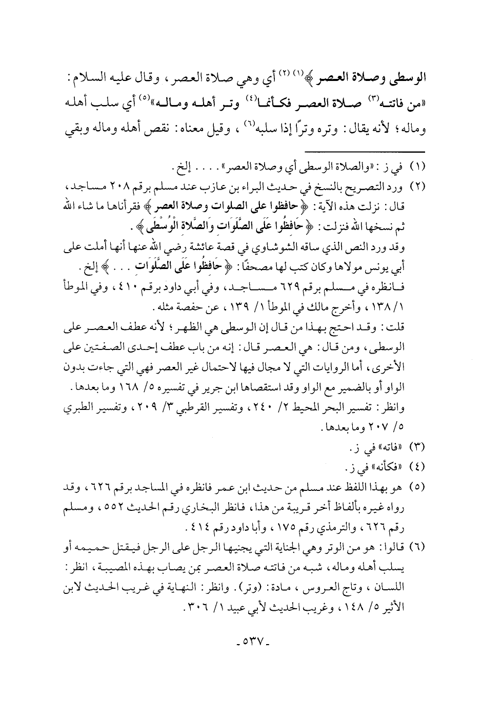 قلت: وقد احتج بهذا من قال إن الوسطى هي الظهر؛ لأنه عطف العصر على الوسطى، ومن قال: هي العصر قال: إنه من باب عطف إحدى الصفتين على الأخرى، أما الروايات التي لا مجال فيها لاحتمال غير العصر فهي التي جاءت بدون الواو أو بالضمير مع الواو وقد استقصاها ابن جرير في تفسيره 5/ 168 وما بعدها.