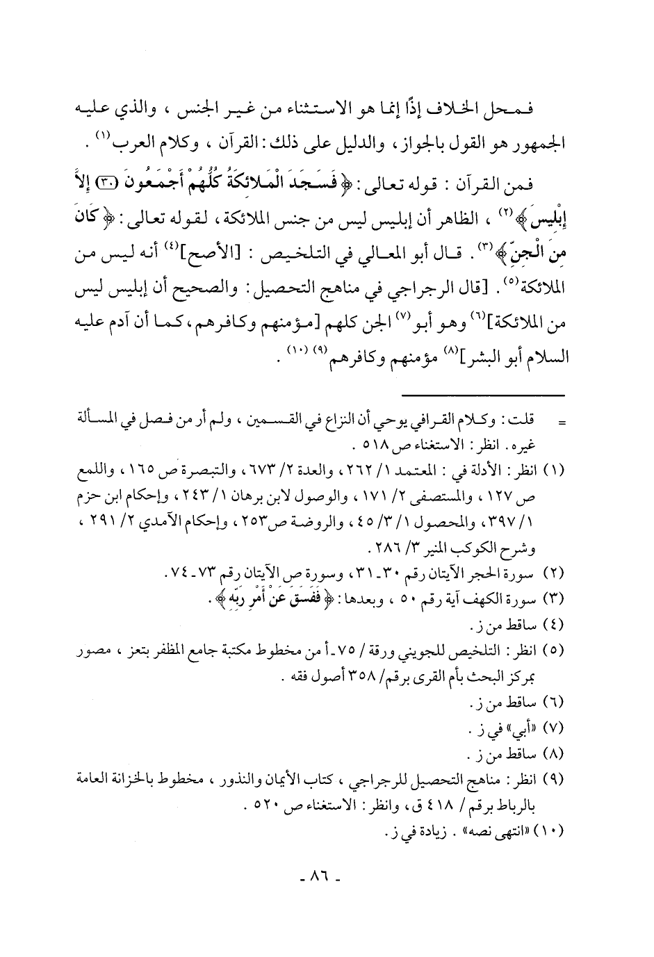 فمن القرآن: قوله تعالى: {فَسَجَدَ الْمَلَائِكَةُ كُلُّهُمْ أَجْمَعُونَ (30) إلا إِبْلِيسَ} (¬2)، الظاهر أن إبليس ليس من جنس الملائكة، لقوله تعالى: {كَانَ مِنَ الْجِنِّ} (¬3). قال أَبو المعالي في التلخيص: [الأصح] (¬4) أنه ليس من الملائكة (¬5). [قال الرجراجي في مناهج التحصيل: والصحيح أن إبليس ليس من الملائكة] (¬6) وهو أَبو (¬7) الجن كلهم [مؤمنهم وكافرهم، كما أن آدم عليه السلام أَبو البشر] (¬8) مؤمنهم وكافرهم (¬9) (¬10).