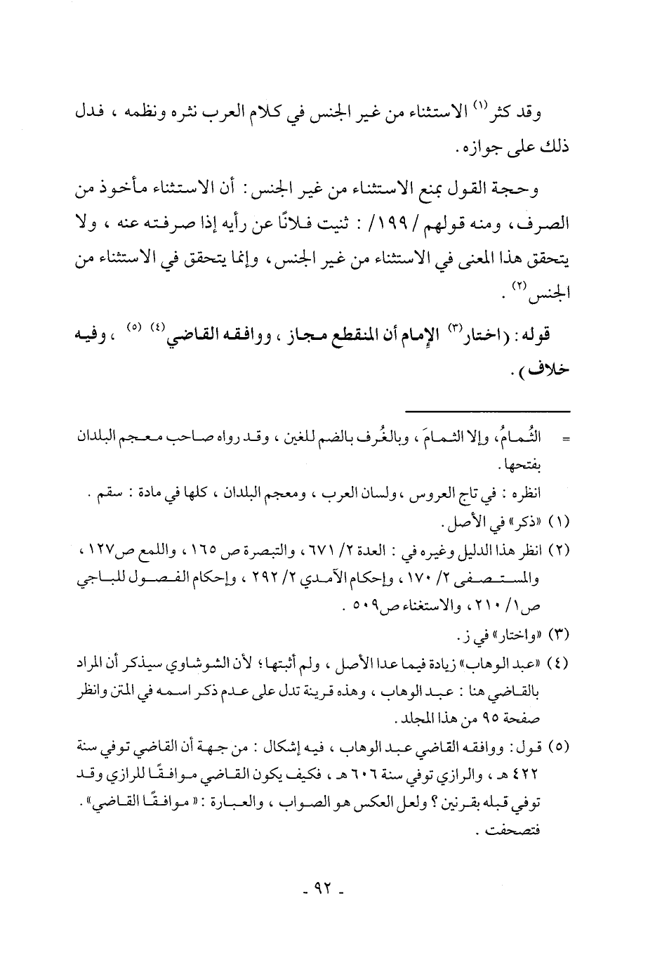 (¬5) قول: ووافقه القاضي عبد الوهاب، فيه إشكال: من جهة أن القاضي توفي سنة 422 هـ، والرازي توفي سنة 606 هـ، فكيف يكون القاضي موافقًا للرازي وقد توفي قبله بقرنين؟ ولعل العكس هو الصواب، والعبارة: "موافقًا القاضي". فتصحفت.