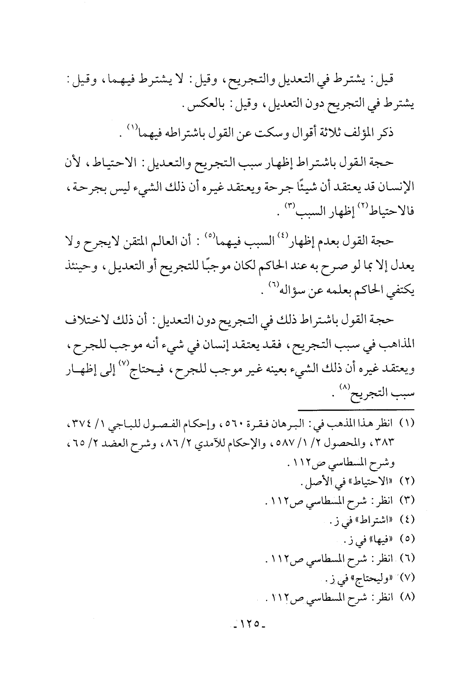 حجة القول باشتراط إظهار سبب التجريح والتعديل: الاحتياط، لأن الإنسان قد يعتقد أن شيئًا جرحة ويعتقد غيره أن ذلك الشيء ليس بجرحة، فالاحتياط (¬2) إظهار السبب (¬3).