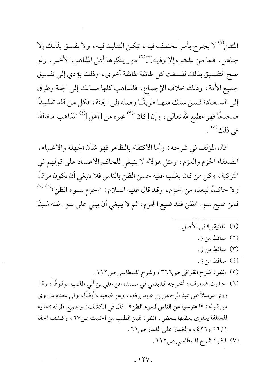 المتقن (¬1) لا يجرح بأمر مختلف فيه، يمكن التقليد فيه، ولا يفسق بذلك إلا جاهل، فما من مذهب إلا وفيه [أ] (¬2) مور ينكرها أهل المذاهب الأخر، ولو صح التفسيق بذلك لفسقت كل طائفة طائفة أخرى، وذلك يؤدي إلى تفسيق جميع الأمة، وذلك خلاف الإجماع، فالمذاهب كلها مسالك إلى الجنة وطرق إلى السعادة فمن سلك منها طريقًا وصله إلى الجنة، فكل من قلد تقليدًا صحيحًا فهو مطيع لله تعالى، وإن [كان] (¬3) غيره من [أهل] (¬4) المذاهب مخالفًا في ذلك (¬5).