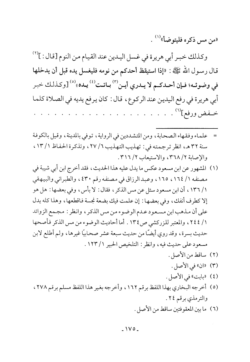 (¬1) المشهور عن ابن مسعود عكس ما يدل عليه هذا الحديث، فقد أخرج ابن أبي شيبة في مصنفه 1/ 164، 165، وعبد الرزاق في مصنفه رقم 430، والطبراني والبيهقي 1/ 136، أن ابن مسعود سئل عن مس الذكر، فقال: لا بأس، وفي بعضها: هل هو إلا كطرف أنفك، وفي بعضها: إن علمت فيك بضعة نجسة فاقطعها، وهذا كله يدل على أن مذهب ابن مسعود عدم الوضوء من مس الذكر، وانظر: مجمع الزوائد 1/ 244، والمعتبر للزركشي ص 134. أما أحاديث الوضوء من مس الذكر فأصحها حديث بسرة، وقد روي أيضًا من حديث سبعة عشر صحابيًا غيرها، ولم أطلع لابن مسعود على حديث فيه، وانظر: التلخيص الحبير 1/ 123.