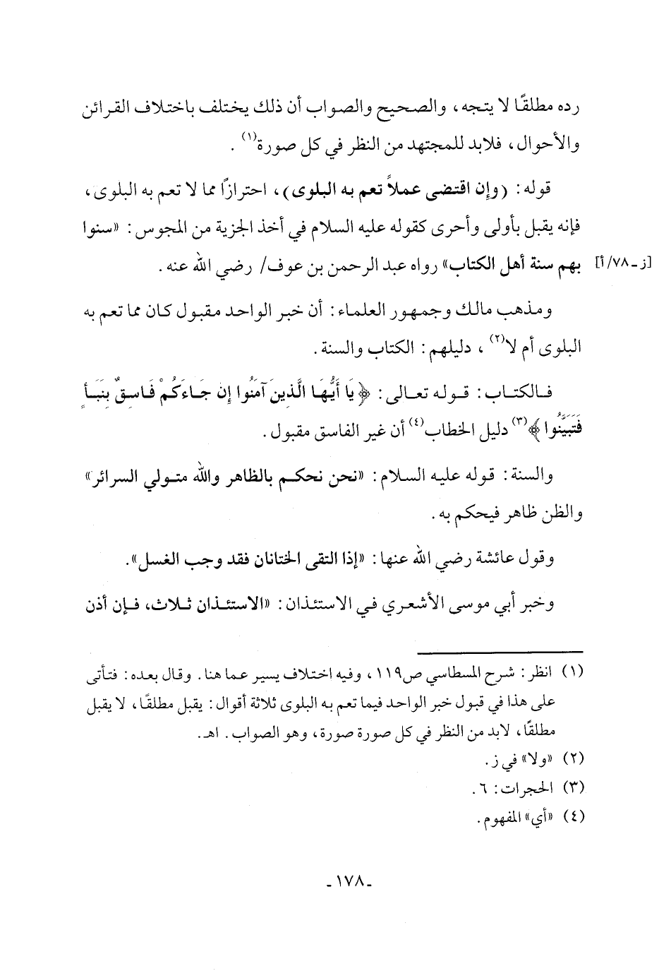 (¬1) انظر: شرح المسطاسي ص 119، وفيه اختلاف يسير عما هنا. وقال بعده: فتأتى على هذا في قبول خبر الواحد فيما تعم به البلوى ثلاثة أقوال: يقبل مطلقًا، لا يقبل مطلقًا، لا بد من النظر في كل صورة صورة، وهو الصواب. اهـ.