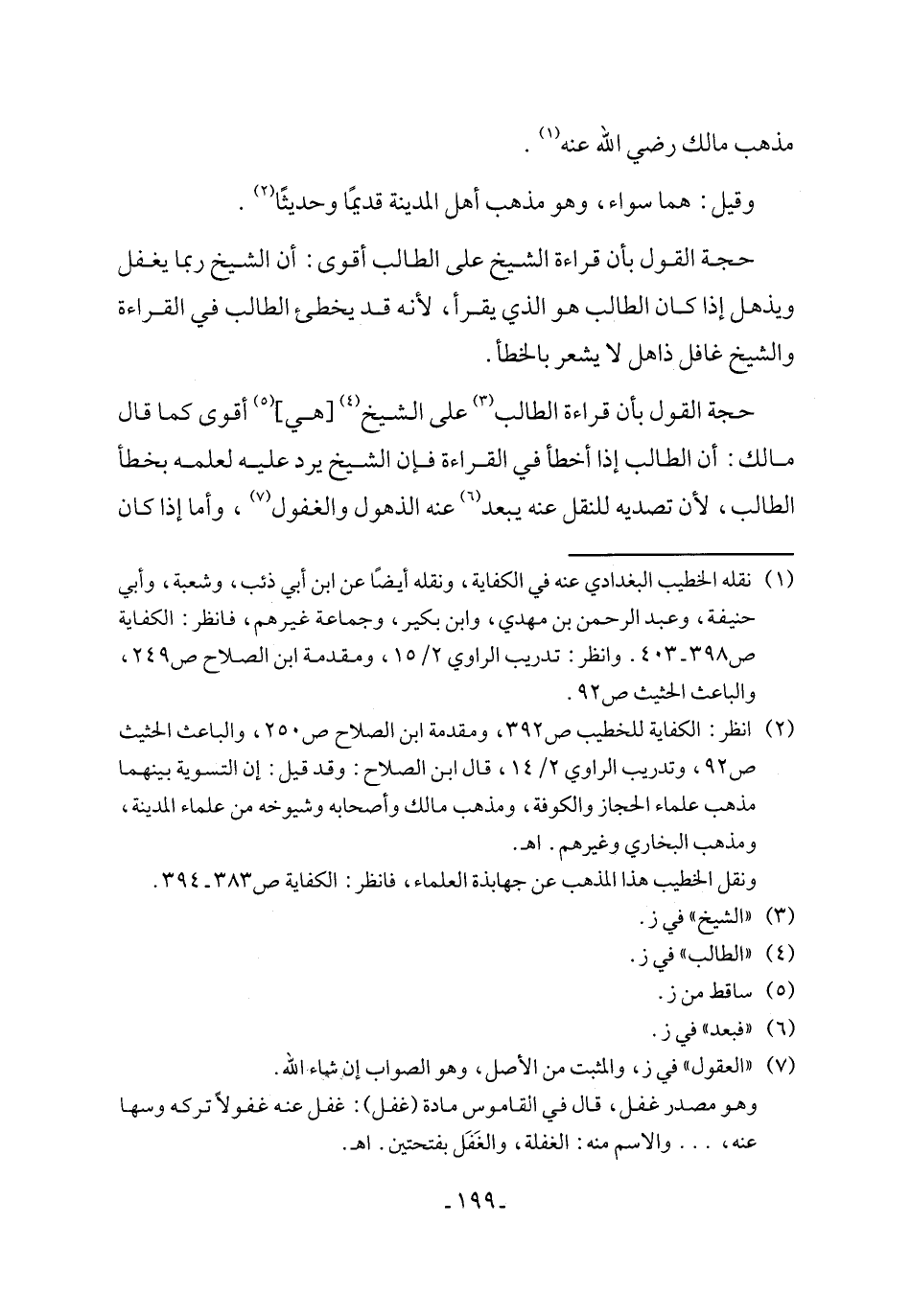 حجة القول بأن قراءة الطالب (¬3) على الشيخ (¬4) [هي] (¬5) أقوى كما قال مالك: أن الطالب إذا أخطأ في القراءة فإن الشيخ يرد عليه لعلمه بخطأ الطالب، لأن تصديه للنقل عنه يبعد (¬6) عنه الذهول والغفول (¬7)، وأما إذا كان