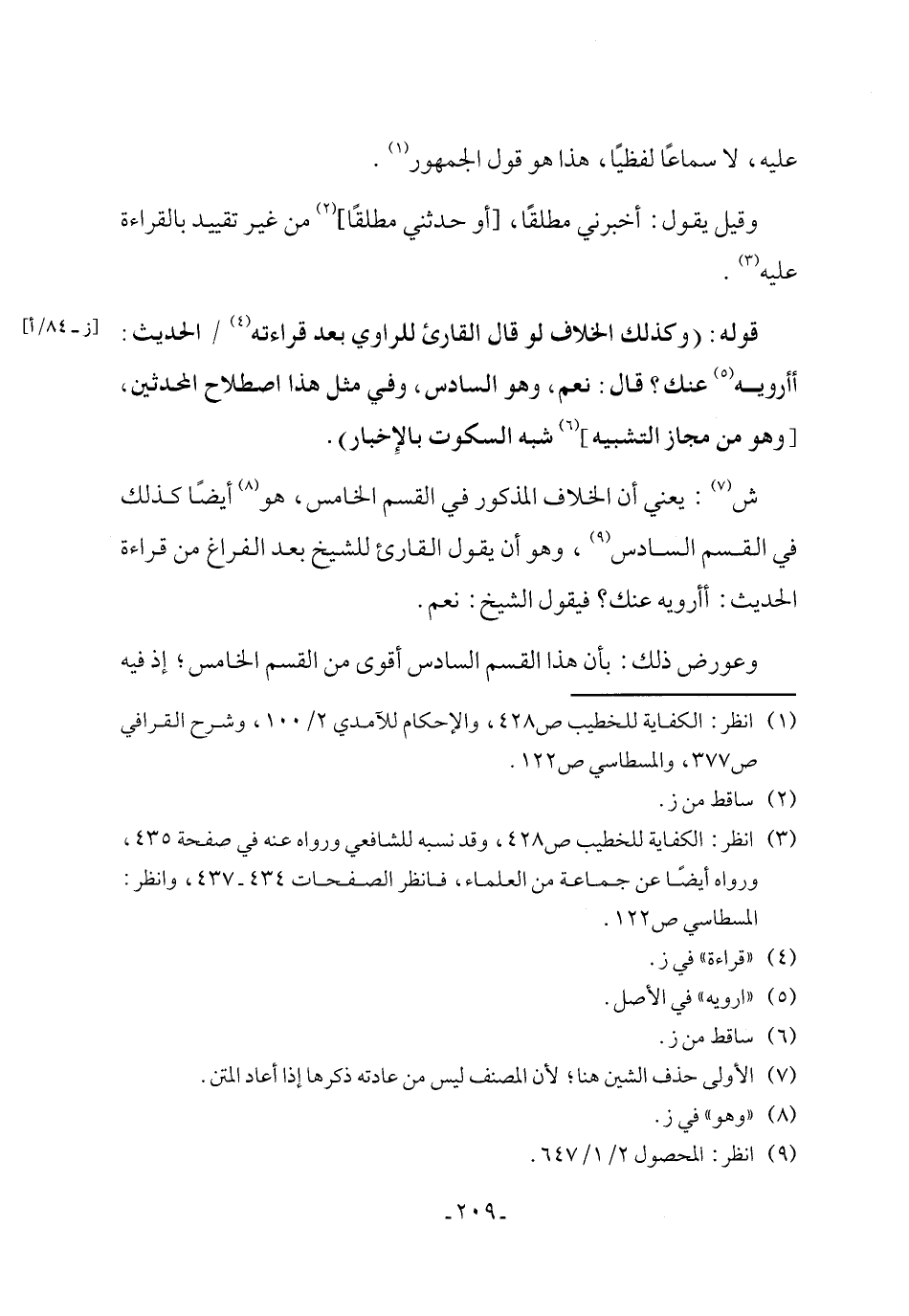ش (¬7): يعني أن الخلاف المذكور في القسم الخامس، هو (¬8) أيضًا كذلك في القسم السادس (¬9)، وهو أن يقول القارئ للشيخ بعد الفراغ من قراءة الحديث: أأرويه عنك؟ فيقول الشيخ: نعم.