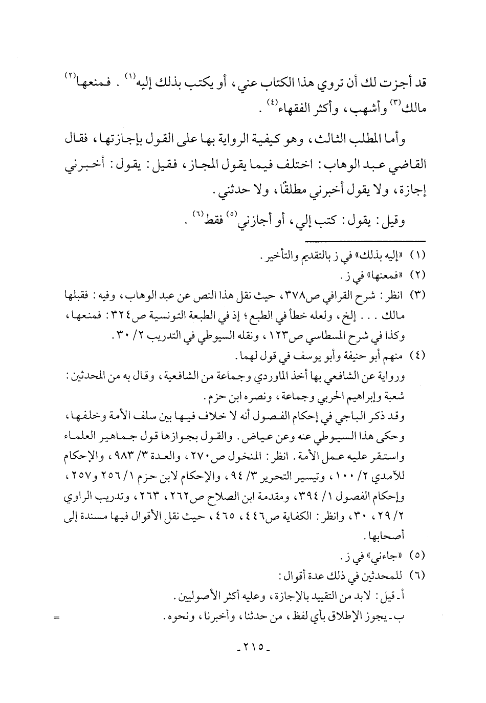 (¬3) انظر: شرح القرافي ص 378، حيث نقل هذا النص عن عبد الوهاب، وفيه: فقبلها مالك ... إلخ، ولعله خطأ في الطبع؛ إذ في الطبعة التونسية ص 324: فمنعها، وكذا في شرح المسطاسي ص 123، ونقله السيوطي في التدريب 2/ 30.