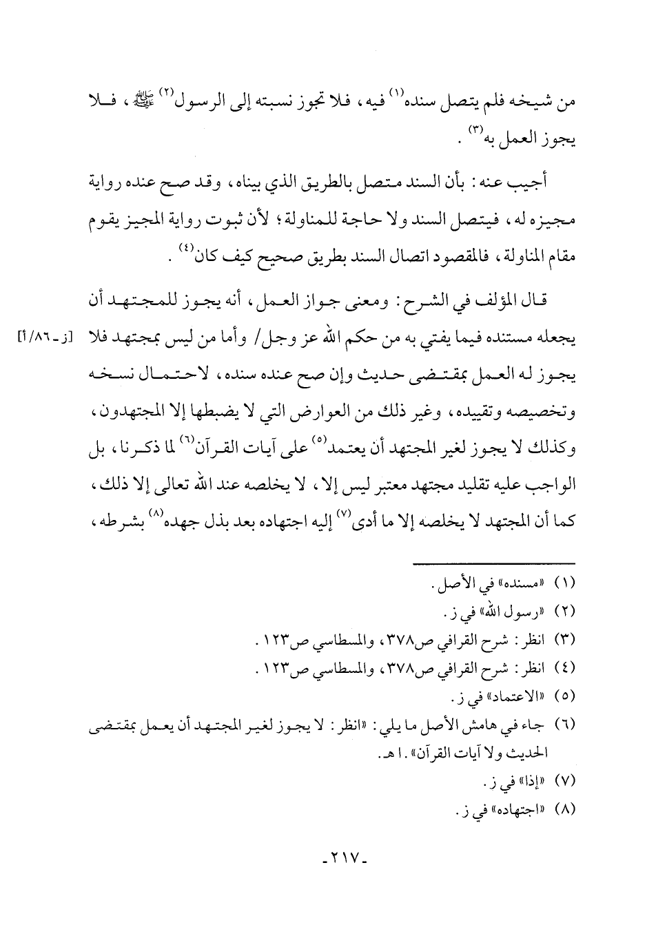 (¬6) جاء في هامش الأصل ما يلي: "انظر: لا يجوز لغير المجتهد أن يعمل بمقتضى الحديث ولا آيات القرآن". اهـ.