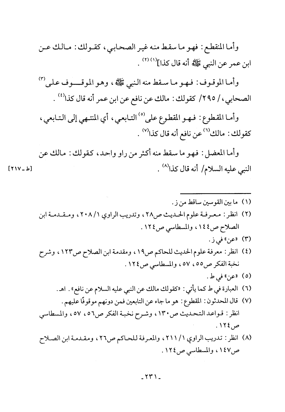 (¬4) انظر: معرفة علوم الحديث للحاكم ص 19، ومقدمة ابن الصلاح ص 123، وشرح نخبة الفكر ص 55، 57، والمسطاسي ص 124.