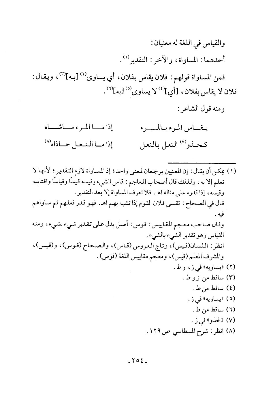 (¬1) يمكن أن يقال: إن المعنيين يرجعان لمعنى واحد؛ إذ المساواة لازم التقدير؛ لأنها لا تعلم إلا به، ولذلك قال أصحاب المعاجم: قاس الشيء يقيسه قيسًا وقياسًا واقتاسه وقيسه، إذا قدره على مثاله اهـ. فلا تعرف المساواة إلا بعد التقدير.