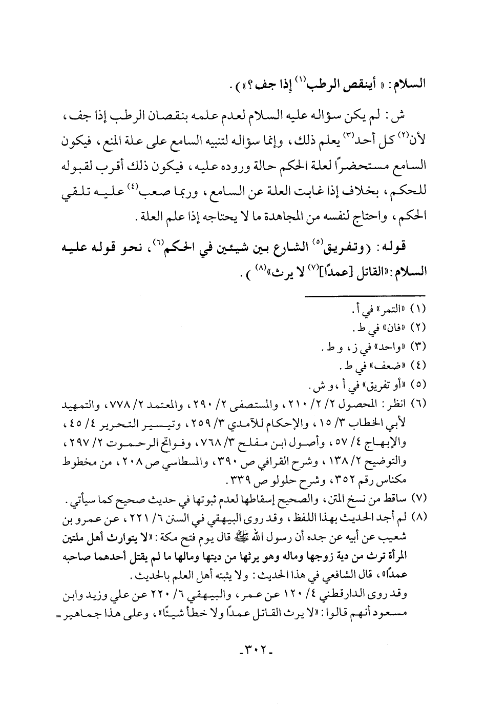 ش: لم يكن سؤاله عليه السلام لعدم علمه بنقصان الرطب إذا جف، لأن (¬2) كل أحد (¬3) يعلم ذلك، وإنما سؤاله لتنبيه السامع على علة المنع، فيكون السامع مستحضرًا لعلة الحكم حالة وروده عليه، فيكون ذلك أقرب لقبوله للحكم، بخلاف إذا غابت العلة عن السامع، وربما صعب (¬4) عليه تلقي الحكم، واحتاج لنفسه من المجاهدة ما لا يحتاجه إذا علم العلة.