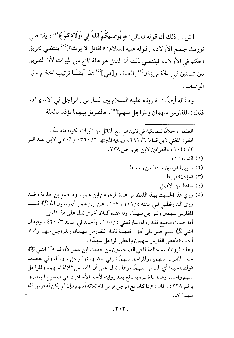 (¬5) روي هذا الحديث بهذا اللفظ من عدة طرق عن ابن عمر، ومجمع بن جارية، فقد روى الدارقطني في سننه 4/ 106، 107، عن ابن عمر أن رسول الله - صلى الله عليه وسلم - قسم للفارس سهمين وللراجل سهمًا. وله عنده ألفاظ أخرى تدل على هذا المعنى.